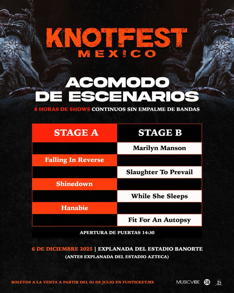 Además, el festival compartió ya su acomodo oficial de escenarios, garantizando lo que muchos aman del concepto KNOTFEST: 8 horas de shows continuos sin empalme, gracias a los escenarios gemelos Stage A y Stage B.